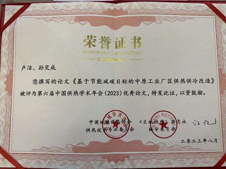 經過中國工程院院士江億教授和30位供熱行業專家的嚴格審核和精心評價,我司研發經理盧潔撰寫的論文《基于節能減碳目標的中原工業廠區供熱供冷改造》最終被評為“第六屆中國供熱學術年會(2023)優秀論文”,同時入選《中國供熱學術年會論文(2023)》電子版U盤。