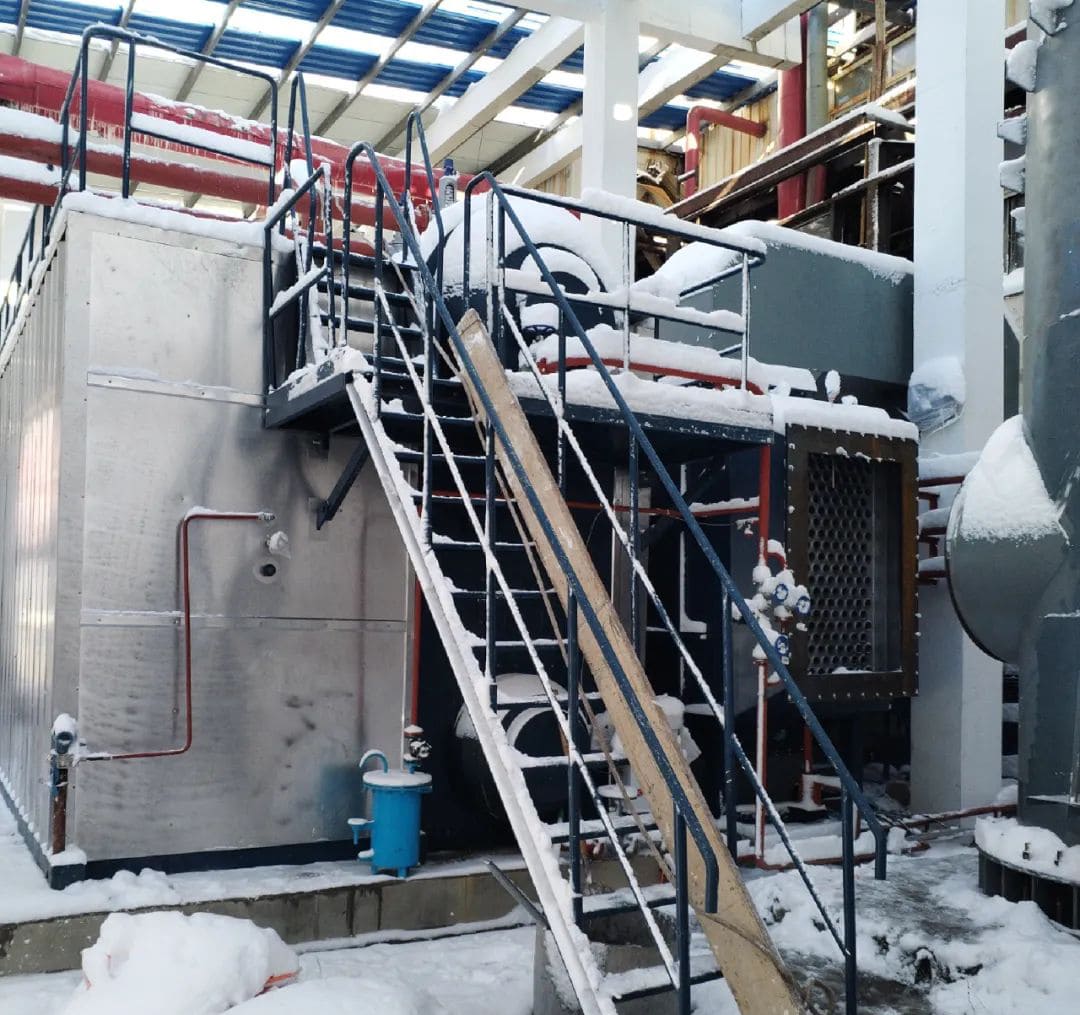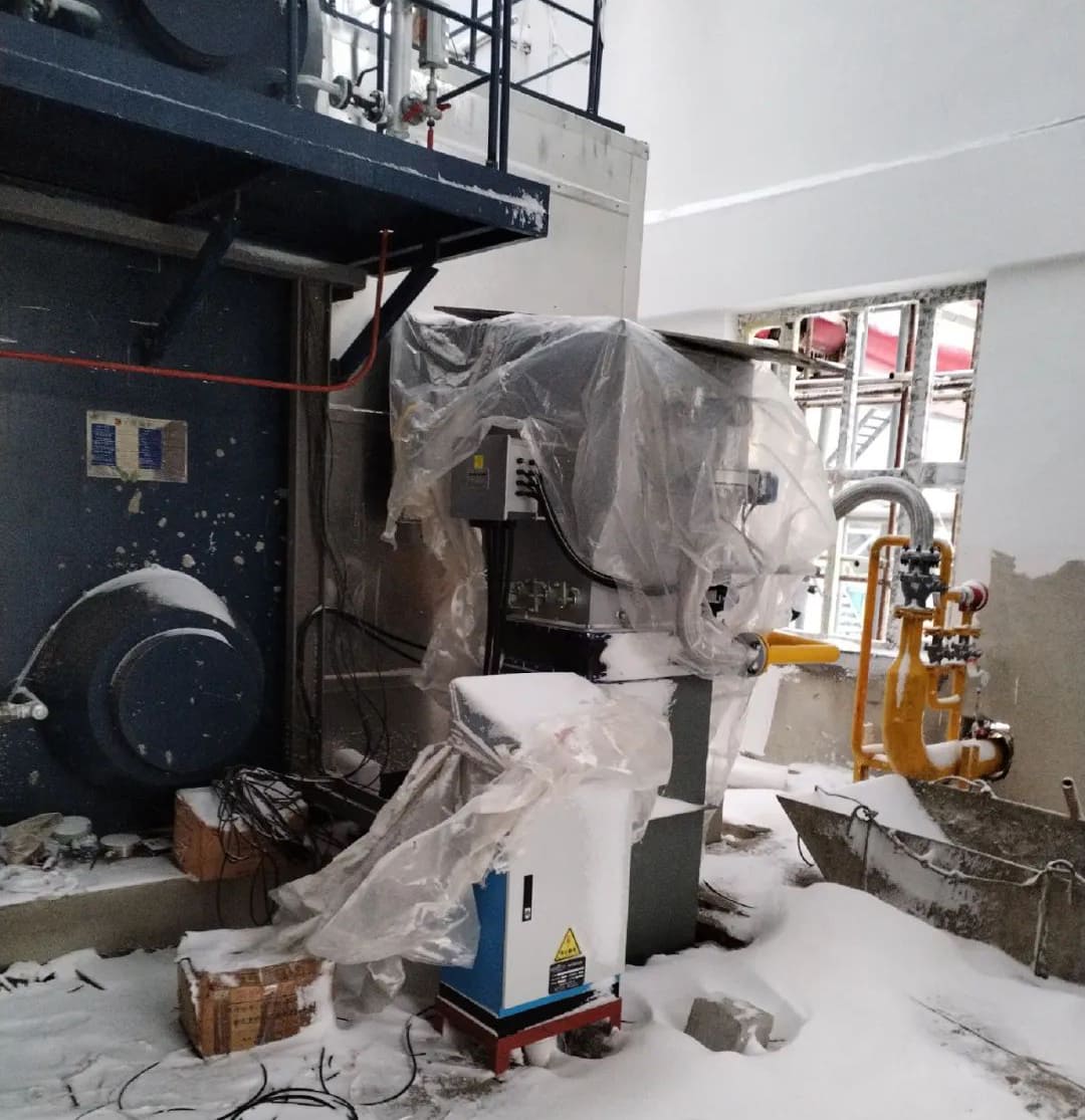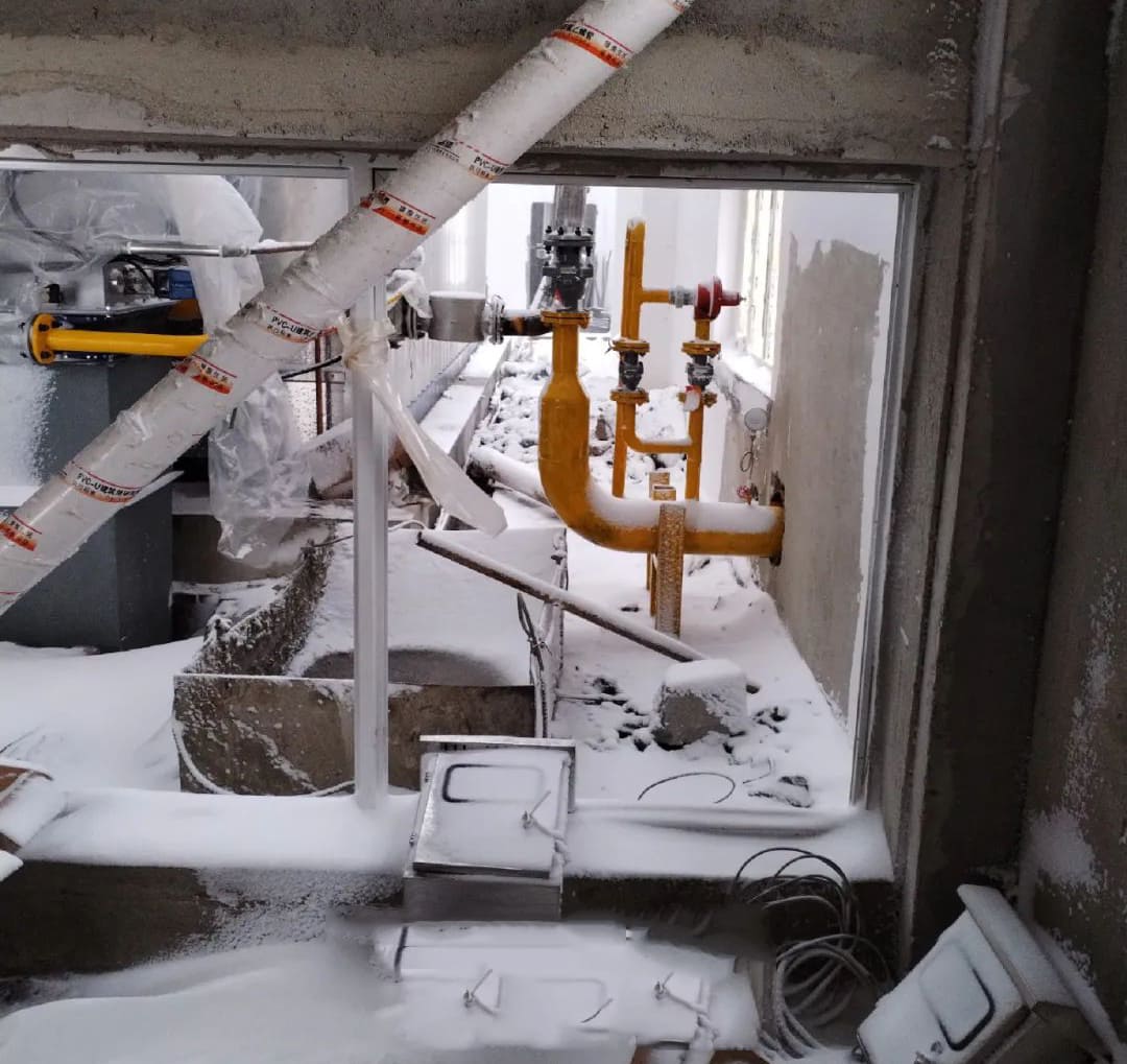 項目地全天持續(xù)下雪,由于沒有房頂和門窗,各施工環(huán)節(jié)都受到影響。整個鍋爐房已被積雪覆蓋并上凍,尹工現(xiàn)場指導安裝公司工人放線,并進行控制箱整改。