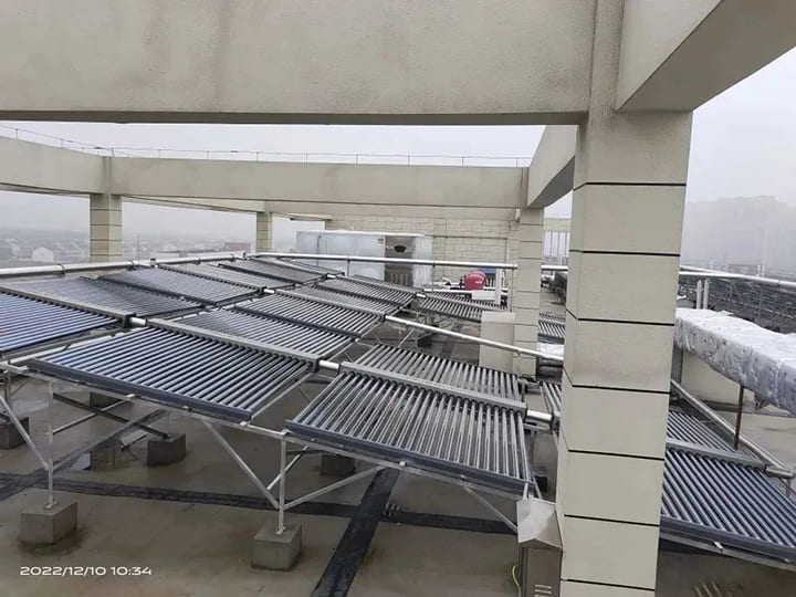設備:11臺V3系列室外型商用容積式熱水爐(熱負荷99Kw)+太陽能集熱器